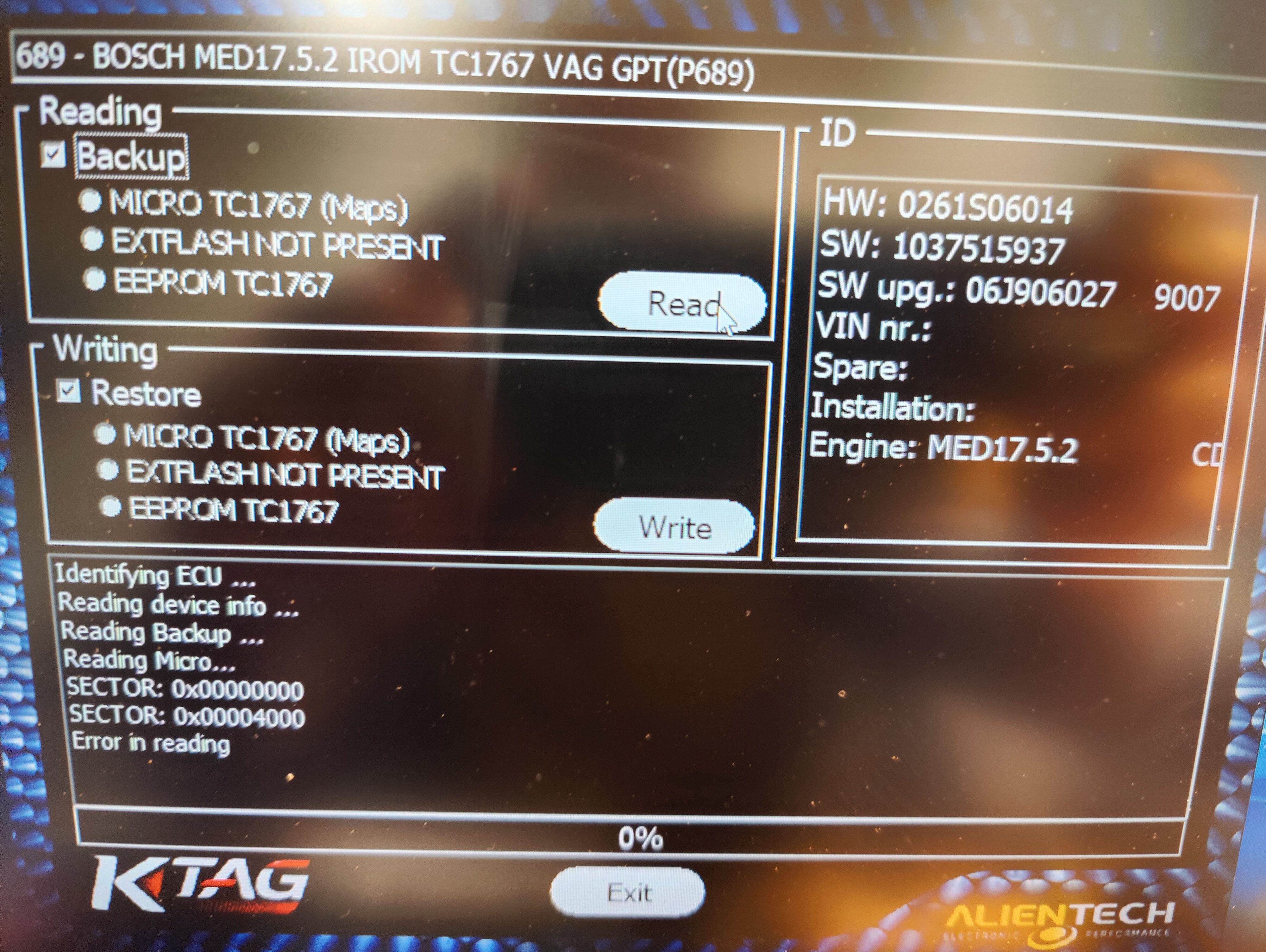 Пассат сс 1.8тси, увалил кессом по обд, да, комментарии про кесс и обд для трайкоров уместны, но суть таже - лёг на 97% записи,процессор 1767, пробовал в буте- ничего, Ktag с jtag по 689 протоколу выдает иденты и считал епром но процессор выдает ошибку чтения на второй же строчке, галлета не взяла, пробовал во множестве разных режимах и протоколах, проц спит, комбика нет