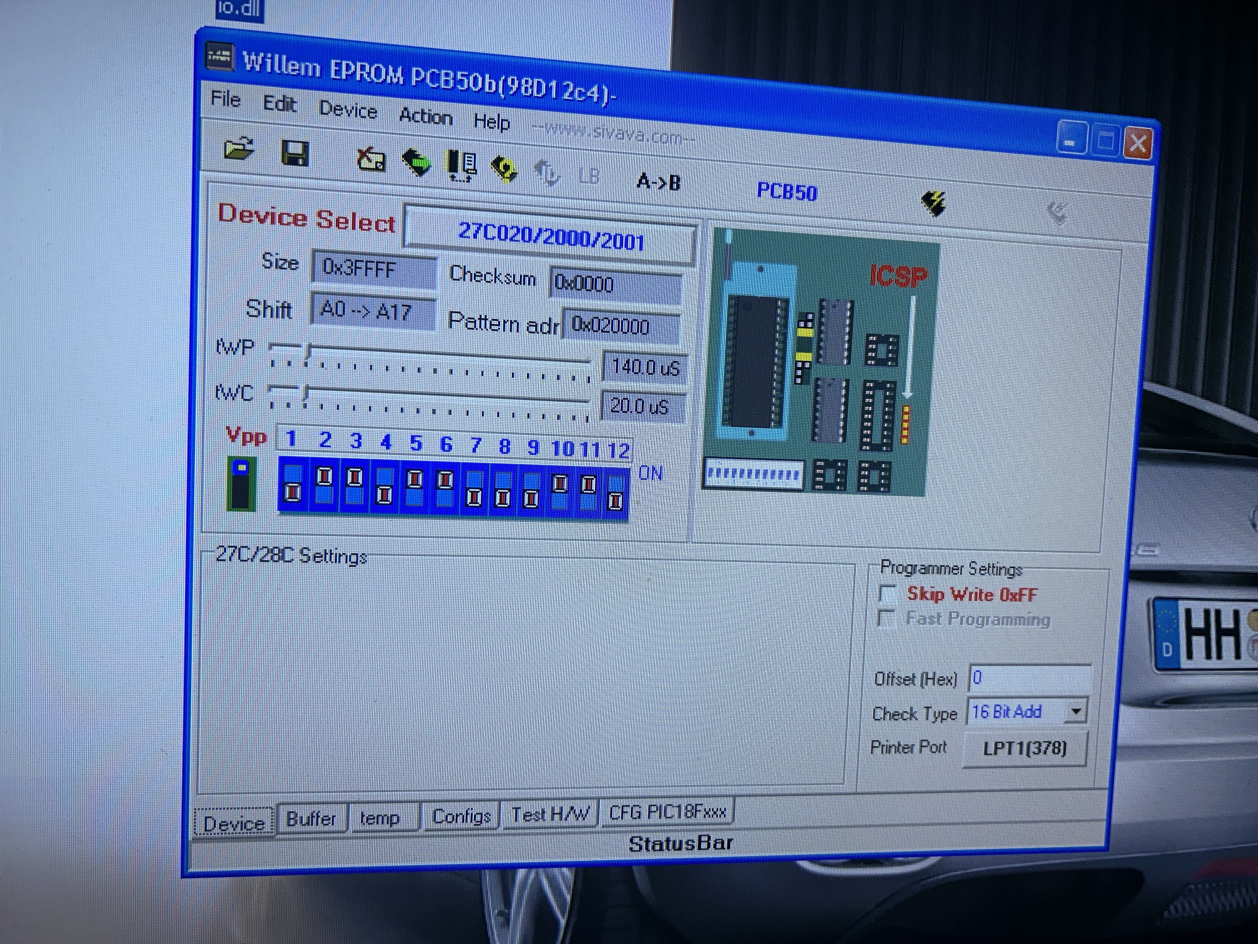 Доброго времени суток , выпаяли микросхемы M27C2001, впаяли каретки , все работает , сейчас хотим разобраться с тюнингом, считываем микросхемы с помощью Willem PCB5.0E , все настройки прилагаю на фотографиях, каждый раз получаем какой то мусор а не прошивку , микросхемы AM29F010B считываются и записываются правильно , проверили , один раз попытались считать штатные микросхемы как AM, но получили битую прошивку ( в edc suite чексумма не сходилась , хотя номер блока определила верно), карты там были далеко не все, если смотреть ручным просмотром через WinOLS, может кто то сталкивался с неправильным чтением микросхем на этом программаторе ? Будем признательны за помощь , файлы полученные прикладываю